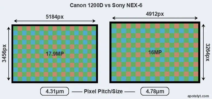 Despite having a smaller sensor, the Canon 1200D offers a higher resolution of 17.9 megapixels, compared with 16 MP of the Sony NEX-6. This megapixels advantage comes at the cost of a higher pixel density and a smaller size of the individual pixel (with a pixel pitch of 4.31μm versus 4.78μm for the NEX-6). However, it should be noted that the 1200D is a somewhat more recent model (by 1 year and 5 months) than the NEX-6, and its sensor might have benefitted from technological advances during this time that partly offset its pixel-size disadvantage.
