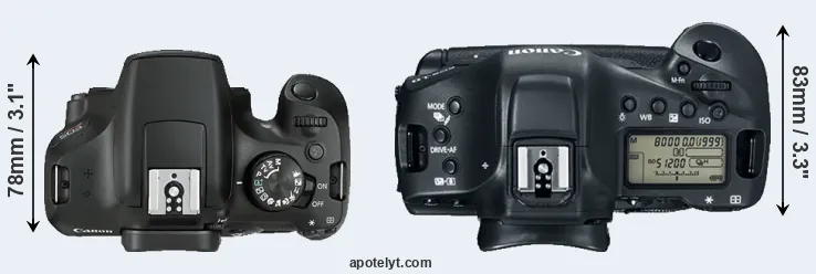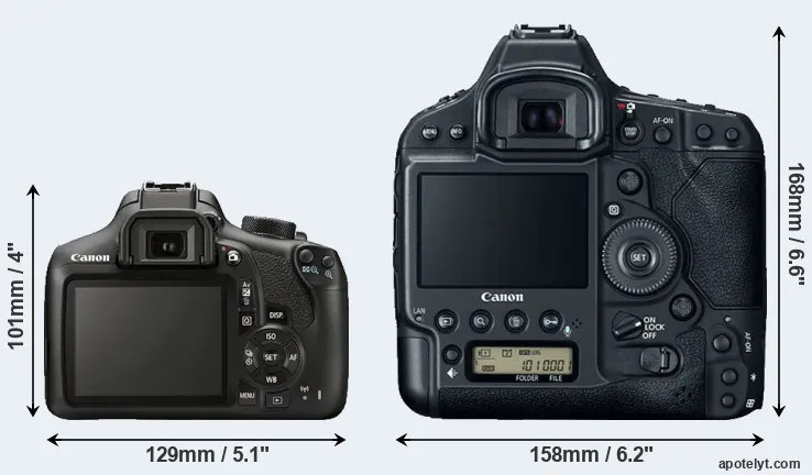 The physical size and weight of the Canon 1300D and the Canon 1D X Mark II are illustrated in the side-by-side display below. The two cameras are presented according to their relative size. Three consecutive views from the front, the top, and the rear side are shown. All width, height and depth measures are rounded to the nearest millimeter.
