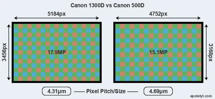 While the two cameras under review share the same sensor size, the 1300D offers a higher resolution of 17.9 megapixels, compared with 15.1 MP of the 500D. This megapixels advantage translates into a 9 percent gain in linear resolution. On the other hand, these sensor specs imply that the 1300D has a higher pixel density and a smaller size of the individual pixel (with a pixel pitch of 4.31μm versus 4.69μm for the 500D). In this context, it should be noted, however, that the 1300D is much more recent (by 6 years and 11 months) than the 500D, and its sensor will have benefitted from technological advances during this time that compensate for the smaller pixel size.