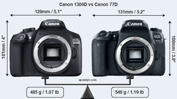 If the front view area (width x height) of the cameras is taken as an aggregate measure of their size, the Canon 1300D and the Canon 77D are of equal size. However, the 77D is markedly heavier (11 percent) than the 1300D. In this context, it is worth noting that neither the 1300D nor the 77D are weather-sealed.