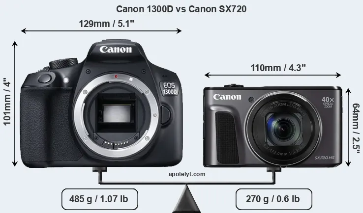 The side-by-side display below illustrates the physical size and weight of the Canon 1300D and the Canon SX720. The two cameras are presented according to their relative size. Three consecutive perspectives from the front, the top, and the back are available. All width, height and depth dimensions are rounded to the nearest millimeter.
