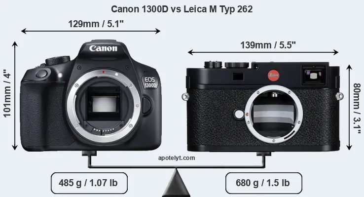 The physical size and weight of the Canon 1300D and the Leica M Typ 262 are illustrated in the side-by-side display below. The two cameras are presented according to their relative size. Three consecutive views from the front, the top, and the rear side are shown. All width, height and depth dimensions are rounded to the nearest millimeter.