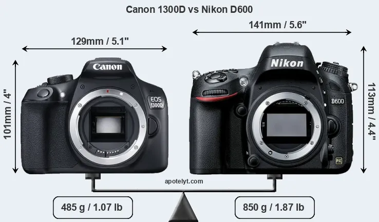 The physical size and weight of the Canon 1300D and the Nikon D600 are illustrated in the side-by-side display below. The two cameras are presented according to their relative size. Three consecutive perspectives from the front, the top, and the back are available. All width, height and depth measures are rounded to the nearest millimeter.