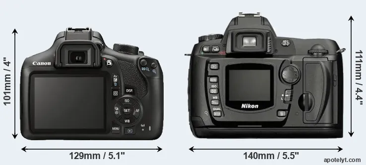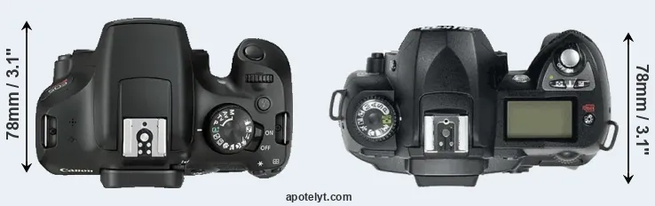 The physical size and weight of the Canon 1300D and the Nikon D70 are illustrated in the side-by-side display below. The two cameras are presented according to their relative size. Three consecutive perspectives from the front, the top, and the back are available. All size dimensions are rounded to the nearest millimeter.