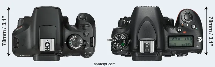 The physical size and weight of the Canon 1300D and the Nikon D750 are illustrated in the side-by-side display below. The two cameras are presented according to their relative size. Three consecutive perspectives from the front, the top, and the back are available. All width, height and depth measures are rounded to the nearest millimeter.