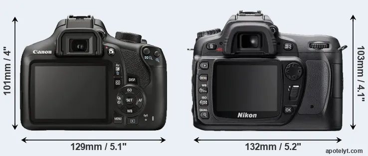 The physical size and weight of the Canon 1300D and the Nikon D80 are illustrated in the side-by-side display below. The two cameras are presented according to their relative size. Three consecutive perspectives from the front, the top, and the back are available. All width, height and depth dimensions are rounded to the nearest millimeter.