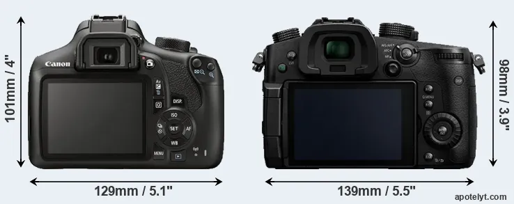 An illustration of the physical size and weight of the Canon 1300D and the Panasonic GH5 is provided in the side-by-side display below. The two cameras are presented according to their relative size. Three consecutive views from the front, the top, and the rear side are shown. All size dimensions are rounded to the nearest millimeter.