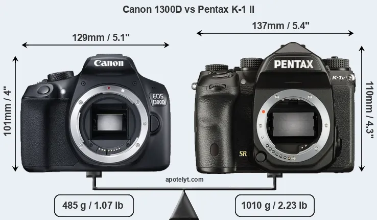 The side-by-side display below illustrates the physical size and weight of the Canon 1300D and the Pentax K-1 II. The two cameras are presented according to their relative size. Three consecutive perspectives from the front, the top, and the back are available. All width, height and depth measures are rounded to the nearest millimeter.