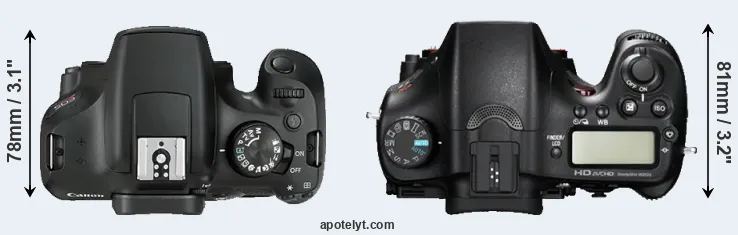 An illustration of the physical size and weight of the Canon 1300D and the Sony A77 is provided in the side-by-side display below. The two cameras are presented according to their relative size. Three consecutive perspectives from the front, the top, and the back are available. All size dimensions are rounded to the nearest millimeter.