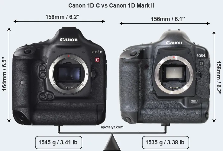 An illustration of the physical size and weight of the Canon 1D C and the Canon 1D Mark II is provided in the side-by-side display below. The two cameras are presented according to their relative size. Three consecutive views from the front, the top, and the rear side are shown. All width, height and depth dimensions are rounded to the nearest millimeter.