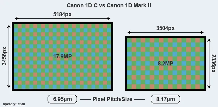 With 17.9MP, the 1DC offers a higher resolution than the 1D Mark II (8.2MP), but the 1DC has smaller individual pixels (pixel pitch of 6.95μm versus 8.17μm for the 1D Mark II). However, the 1DC is a much more recent model (by 8 years and 2 months) than the 1D Mark II, and its sensor will have benefitted from technological advances during this time that enhance the light gathering capacity of its pixels.