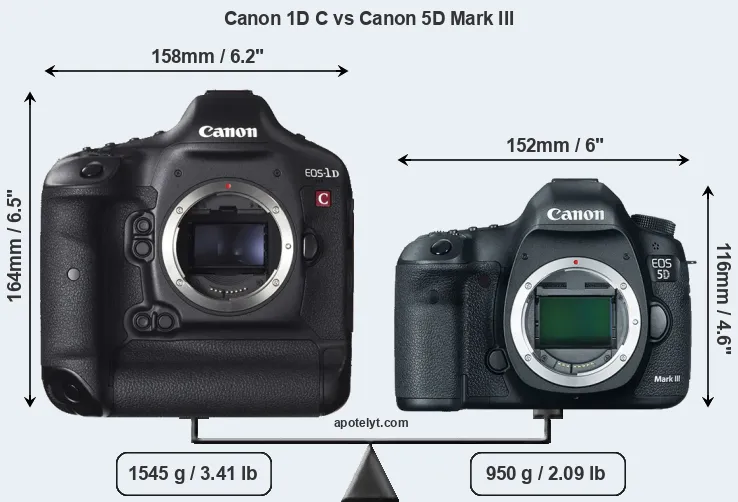 The side-by-side display below illustrates the physical size and weight of the Canon 1D C and the Canon 5D Mark III. The two cameras are presented according to their relative size. Three successive views from the front, the top, and the rear are shown. All size dimensions are rounded to the nearest millimeter.
