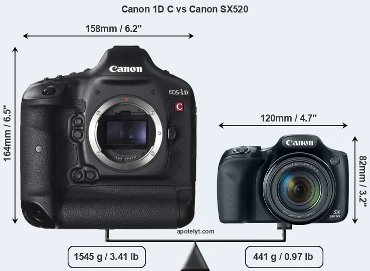 An illustration of the physical size and weight of the Canon 1D C and the Canon SX520 is provided in the side-by-side display below. The two cameras are presented according to their relative size. Three consecutive views from the front, the top, and the rear side are shown. All width, height and depth measures are rounded to the nearest millimeter.