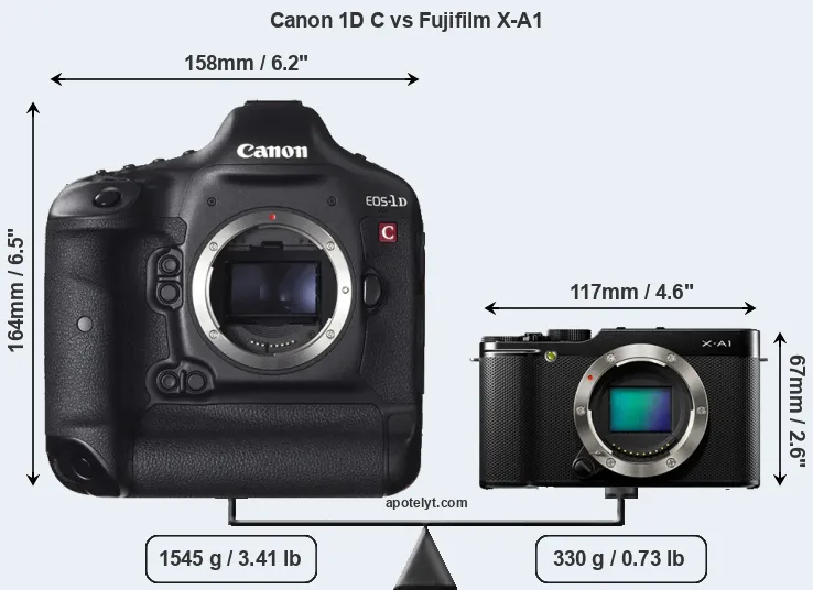 The physical size and weight of the Canon 1D C and the Fujifilm X-A1 are illustrated in the side-by-side display below. The two cameras are presented according to their relative size. Three consecutive views from the front, the top, and the rear side are shown. All width, height and depth measures are rounded to the nearest millimeter.