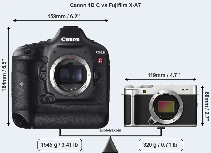 The side-by-side display below illustrates the physical size and weight of the Canon 1D C and the Fujifilm X-A7. The two cameras are presented according to their relative size. Three successive views from the front, the top, and the rear are shown. All size dimensions are rounded to the nearest millimeter.