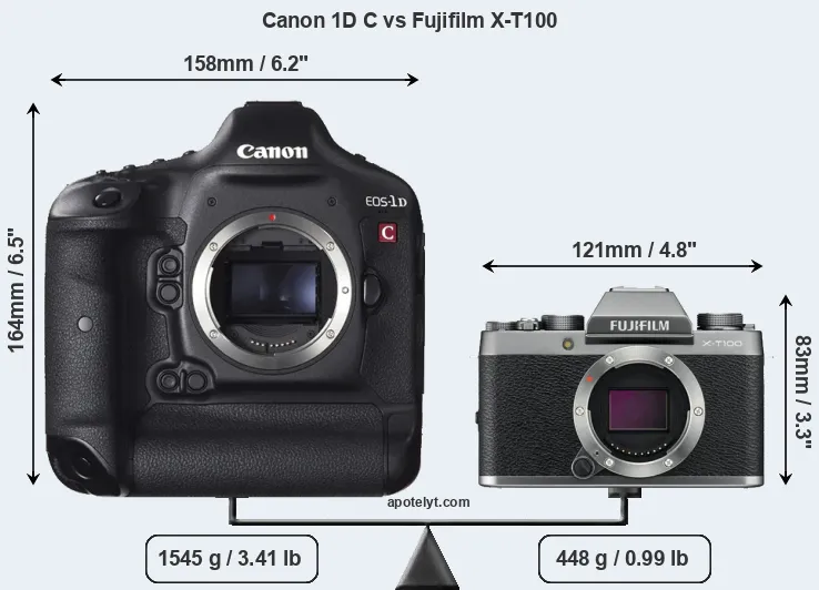 The physical size and weight of the Canon 1D C and the Fujifilm X-T100 are illustrated in the side-by-side display below. The two cameras are presented according to their relative size. Three successive views from the front, the top, and the rear are shown. All size dimensions are rounded to the nearest millimeter.