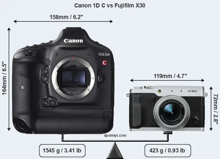 The physical size and weight of the Canon 1D C and the Fujifilm X30 are illustrated in the side-by-side display below. The two cameras are presented according to their relative size. Three successive views from the front, the top, and the rear are shown. All width, height and depth measures are rounded to the nearest millimeter.