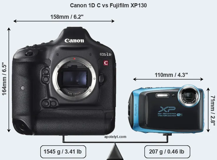 The side-by-side display below illustrates the physical size and weight of the Canon 1D C and the Fujifilm XP130. The two cameras are presented according to their relative size. Three successive views from the front, the top, and the rear are shown. All size dimensions are rounded to the nearest millimeter.