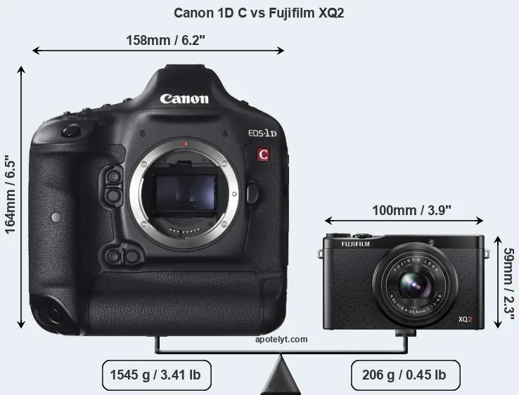 An illustration of the physical size and weight of the Canon 1D C and the Fujifilm XQ2 is provided in the side-by-side display below. The two cameras are presented according to their relative size. Three consecutive perspectives from the front, the top, and the back are available. All width, height and depth measures are rounded to the nearest millimeter.