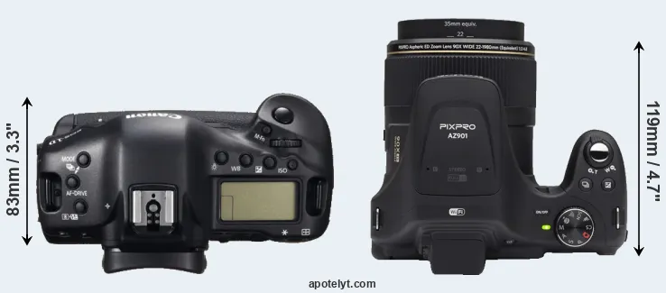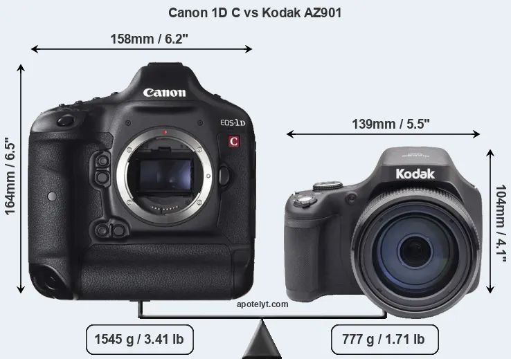 The side-by-side display below illustrates the physical size and weight of the Canon 1D C and the Kodak AZ901. The two cameras are presented according to their relative size. Three consecutive views from the front, the top, and the rear side are shown. All width, height and depth measures are rounded to the nearest millimeter.