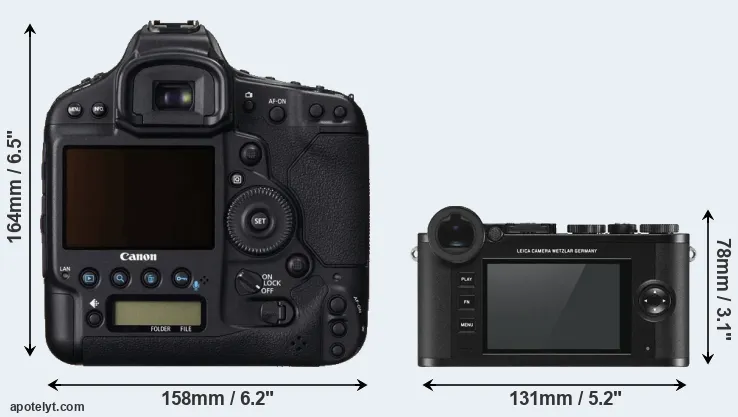 An illustration of the physical size and weight of the Canon 1D C and the Leica CL is provided in the side-by-side display below. The two cameras are presented according to their relative size. Three consecutive views from the front, the top, and the rear side are shown. All size dimensions are rounded to the nearest millimeter.