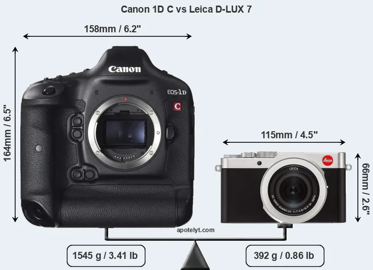 The side-by-side display below illustrates the physical size and weight of the Canon 1D C and the Leica D-LUX 7. The two cameras are presented according to their relative size. Three consecutive perspectives from the front, the top, and the back are available. All size dimensions are rounded to the nearest millimeter.