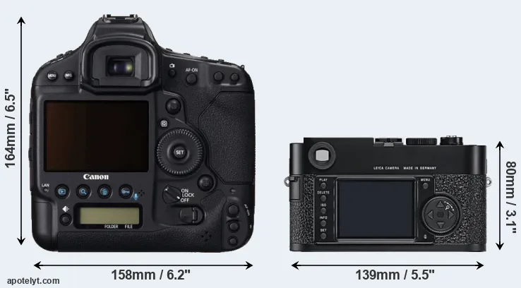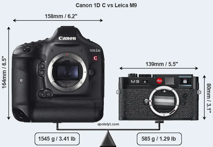 An illustration of the physical size and weight of the Canon 1D C and the Leica M9 is provided in the side-by-side display below. The two cameras are presented according to their relative size. Three consecutive views from the front, the top, and the rear side are shown. All width, height and depth measures are rounded to the nearest millimeter.