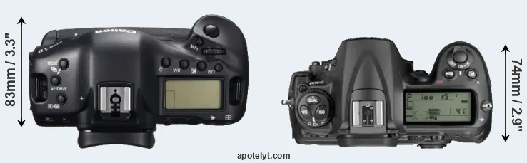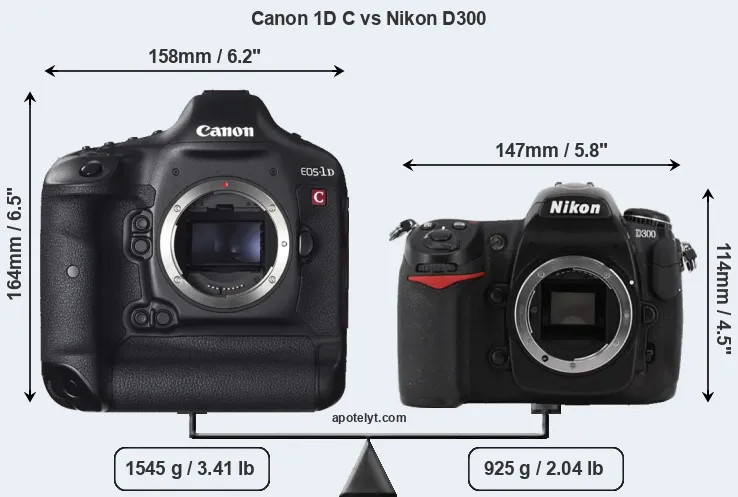 An illustration of the physical size and weight of the Canon 1D C and the Nikon D300 is provided in the side-by-side display below. The two cameras are presented according to their relative size. Three consecutive views from the front, the top, and the rear side are shown. All width, height and depth measures are rounded to the nearest millimeter.