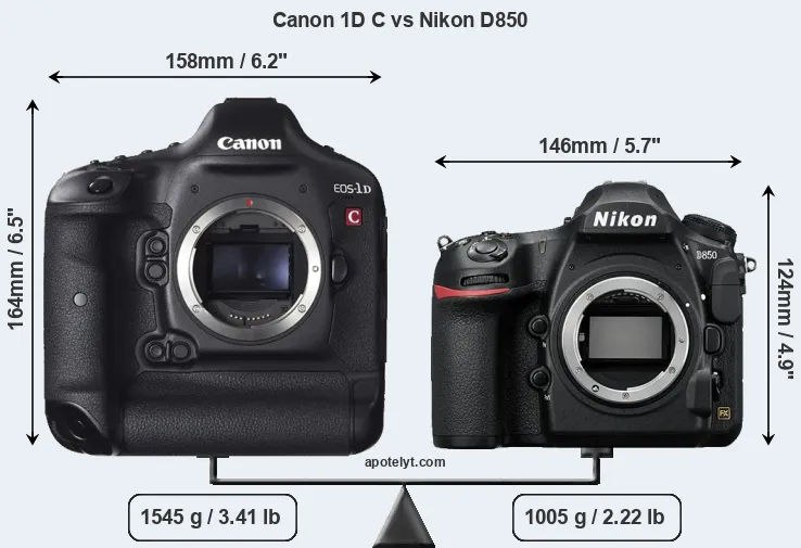 An illustration of the physical size and weight of the Canon 1D C and the Nikon D850 is provided in the side-by-side display below. The two cameras are presented according to their relative size. Three successive views from the front, the top, and the rear are shown. All width, height and depth dimensions are rounded to the nearest millimeter.