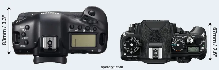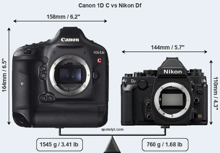 The side-by-side display below illustrates the physical size and weight of the Canon 1D C and the Nikon Df. The two cameras are presented according to their relative size. Three successive views from the front, the top, and the rear are shown. All size dimensions are rounded to the nearest millimeter.