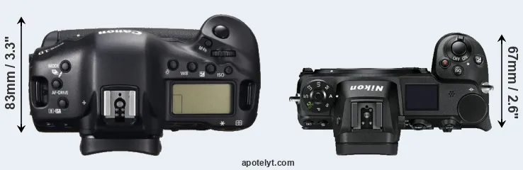 An illustration of the physical size and weight of the Canon 1D C and the Nikon Z7 is provided in the side-by-side display below. The two cameras are presented according to their relative size. Three consecutive perspectives from the front, the top, and the back are available. All width, height and depth dimensions are rounded to the nearest millimeter.