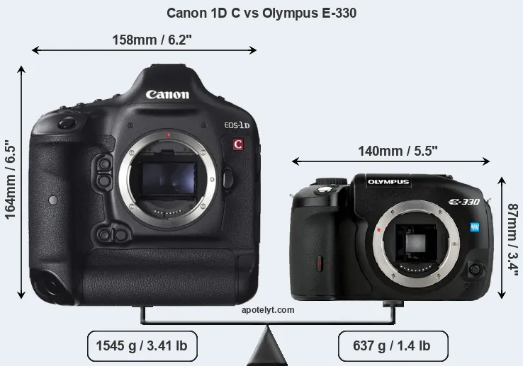 The side-by-side display below illustrates the physical size and weight of the Canon 1D C and the Olympus E-330. The two cameras are presented according to their relative size. Three successive views from the front, the top, and the rear are shown. All width, height and depth dimensions are rounded to the nearest millimeter.
