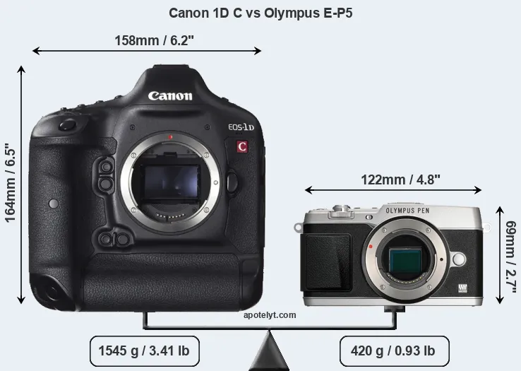 An illustration of the physical size and weight of the Canon 1D C and the Olympus E-P5 is provided in the side-by-side display below. The two cameras are presented according to their relative size. Three consecutive views from the front, the top, and the rear side are shown. All width, height and depth dimensions are rounded to the nearest millimeter.