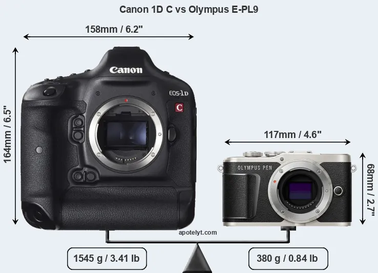 If the front view area (width x height) of the cameras is taken as an aggregate measure of their size, the Olympus E-PL9 is considerably smaller (69 percent) than the Canon 1D C. Moreover, the E-PL9 is substantially lighter (75 percent) than the 1DC. It is worth mentioning in this context that the 1DC is splash and dust resistant, while the E-PL9 does not feature any corresponding weather-sealing.