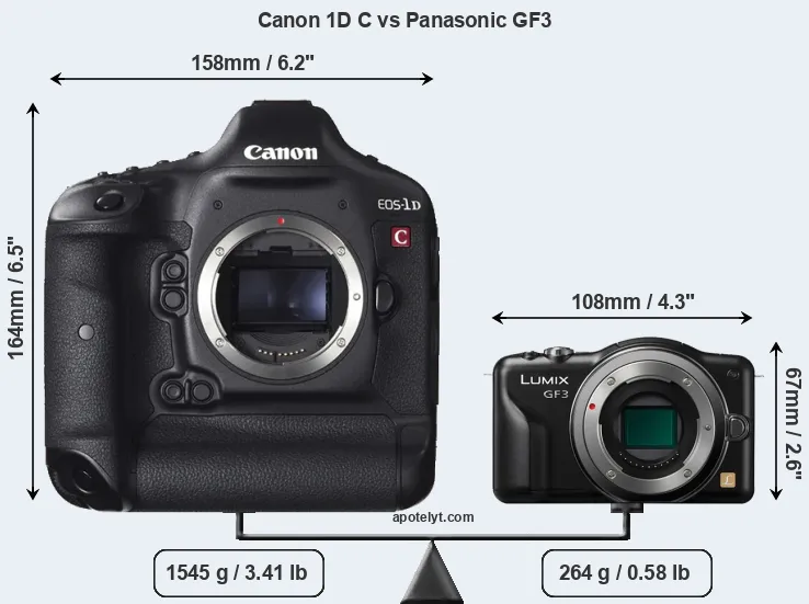 If the front view area (width x height) of the cameras is taken as an aggregate measure of their size, the Panasonic GF3 is considerably smaller (72 percent) than the Canon 1D C. Moreover, the GF3 is substantially lighter (83 percent) than the 1DC. It is worth mentioning in this context that the 1DC is splash and dust resistant, while the GF3 does not feature any corresponding weather-sealing.