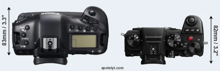 An illustration of the physical size and weight of the Canon 1D C and the Panasonic S5 is provided in the side-by-side display below. The two cameras are presented according to their relative size. Three successive views from the front, the top, and the rear are shown. All width, height and depth measures are rounded to the nearest millimeter.