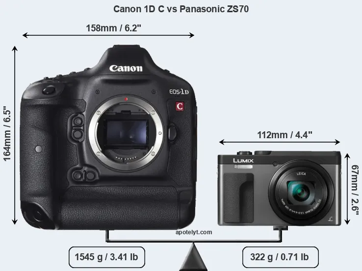 An illustration of the physical size and weight of the Canon 1D C and the Panasonic ZS70 is provided in the side-by-side display below. The two cameras are presented according to their relative size. Three successive views from the front, the top, and the rear are shown. All width, height and depth dimensions are rounded to the nearest millimeter.