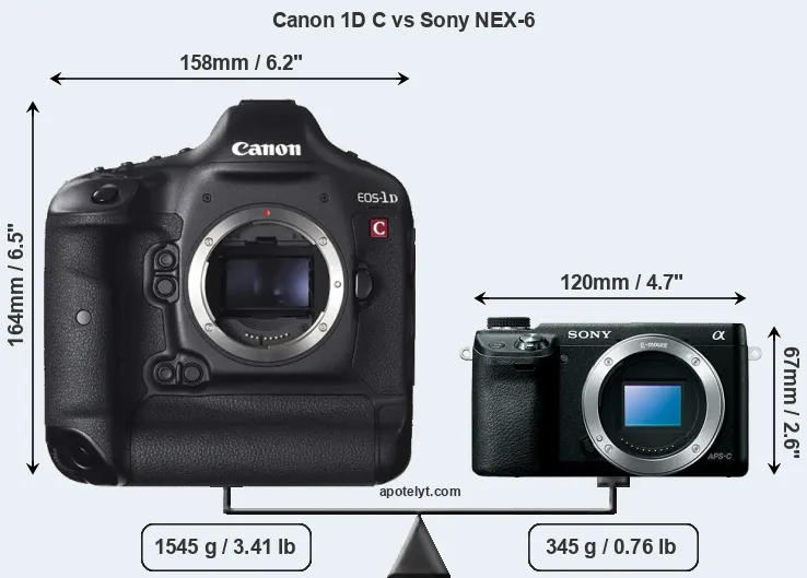 The physical size and weight of the Canon 1D C and the Sony NEX-6 are illustrated in the side-by-side display below. The two cameras are presented according to their relative size. Three consecutive views from the front, the top, and the rear side are shown. All width, height and depth measures are rounded to the nearest millimeter.