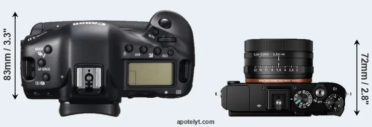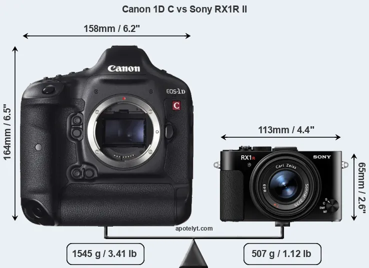 The side-by-side display below illustrates the physical size and weight of the Canon 1D C and the Sony RX1R II. The two cameras are presented according to their relative size. Three consecutive perspectives from the front, the top, and the back are available. All width, height and depth measures are rounded to the nearest millimeter.