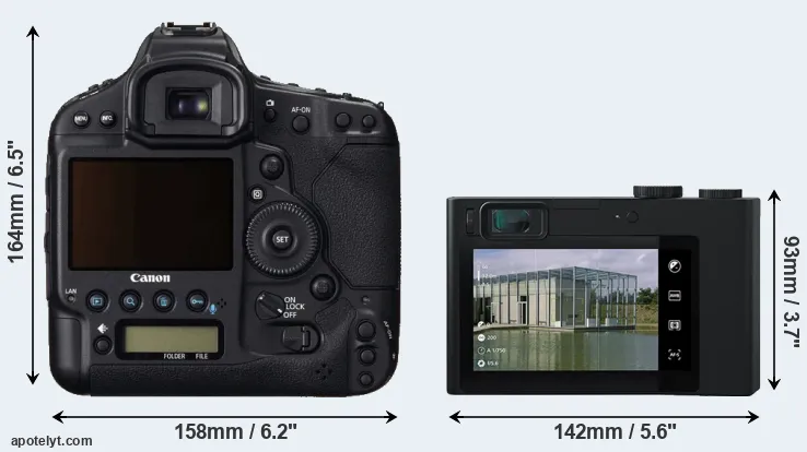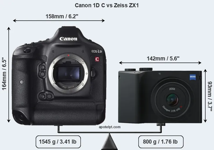 The physical size and weight of the Canon 1D C and the Zeiss ZX1 are illustrated in the side-by-side display below. The two cameras are presented according to their relative size. Three successive views from the front, the top, and the rear are shown. All width, height and depth measures are rounded to the nearest millimeter.