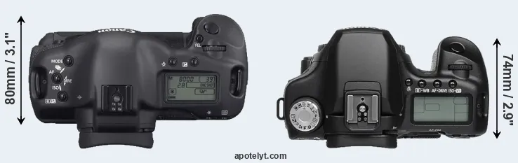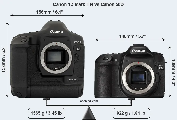 The physical size and weight of the Canon 1D Mark II N and the Canon 50D are illustrated in the side-by-side display below. The two cameras are presented according to their relative size. Three successive views from the front, the top, and the rear are shown. All width, height and depth measures are rounded to the nearest millimeter.