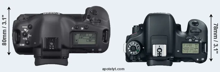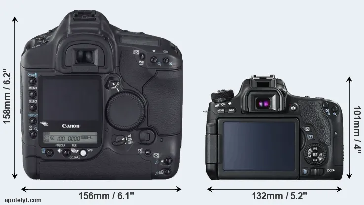 The physical size and weight of the Canon 1D Mark II N and the Canon 760D are illustrated in the side-by-side display below. The two cameras are presented according to their relative size. Three consecutive perspectives from the front, the top, and the back are available. All width, height and depth measures are rounded to the nearest millimeter.