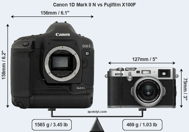 If the front view area (width x height) of the cameras is taken as an aggregate measure of their size, the Fujifilm X100F is considerably smaller (61 percent) than the Canon 1D Mark II N. It is worth mentioning in this context that the 1D Mark II N is splash and dust resistant, while the X100F does not feature any corresponding weather-sealing.