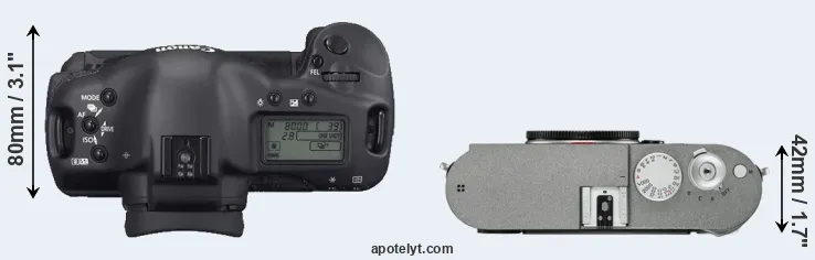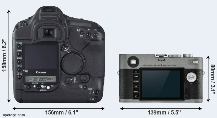 The physical size and weight of the Canon 1D Mark II N and the Leica M-E Typ 240 are illustrated in the side-by-side display below. The two cameras are presented according to their relative size. Three consecutive perspectives from the front, the top, and the back are available. All size dimensions are rounded to the nearest millimeter.