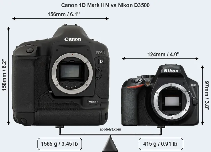 The side-by-side display below illustrates the physical size and weight of the Canon 1D Mark II N and the Nikon D3500. The two cameras are presented according to their relative size. Three consecutive perspectives from the front, the top, and the back are available. All width, height and depth measures are rounded to the nearest millimeter.