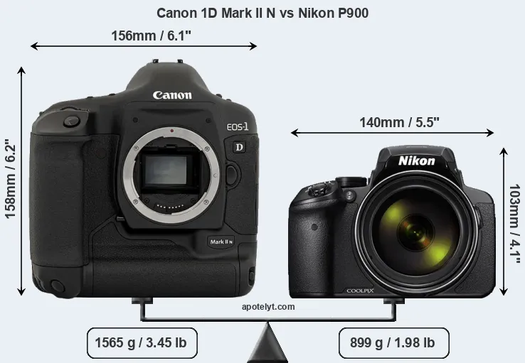 The physical size and weight of the Canon 1D Mark II N and the Nikon P900 are illustrated in the side-by-side display below. The two cameras are presented according to their relative size. Three consecutive views from the front, the top, and the rear side are shown. All size dimensions are rounded to the nearest millimeter.
