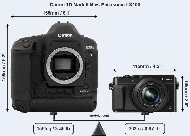 The side-by-side display below illustrates the physical size and weight of the Canon 1D Mark II N and the Panasonic LX100. The two cameras are presented according to their relative size. Three successive views from the front, the top, and the rear are shown. All width, height and depth measures are rounded to the nearest millimeter.