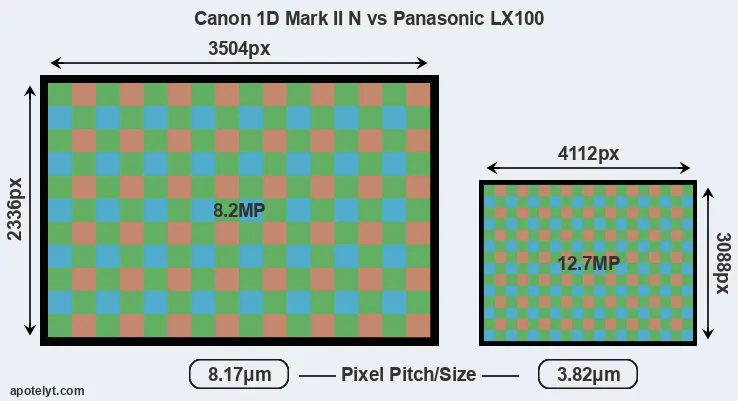 Despite having a smaller sensor, the LX100 offers a higher resolution of 12.7 megapixels, compared with 8.2 MP of the 1D Mark II N. This megapixels advantage comes at the cost of a higher pixel density and a smaller size of the individual pixel (with a pixel pitch of 3.82μm versus 8.17μm for the 1D Mark II N). However, it should be noted that the LX100 is much more recent (by 9 years) than the 1D Mark II N, and its sensor will have benefitted from technological advances during this time that make it possible to gather light more efficiently.