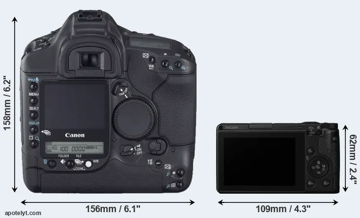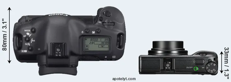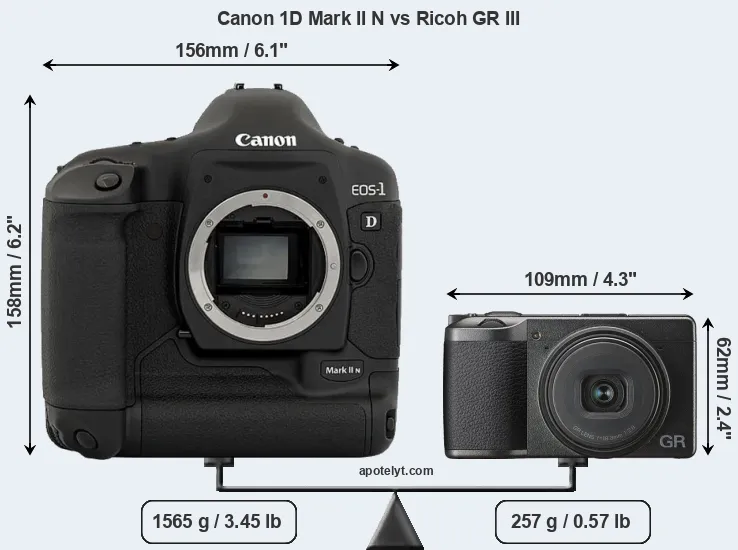 An illustration of the physical size and weight of the Canon 1D Mark II N and the Ricoh GR III is provided in the side-by-side display below. The two cameras are presented according to their relative size. Three successive views from the front, the top, and the rear are shown. All width, height and depth dimensions are rounded to the nearest millimeter.