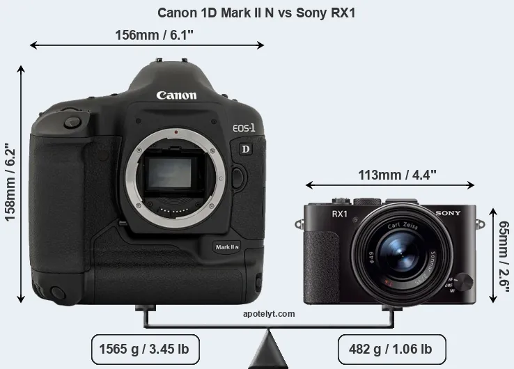 An illustration of the physical size and weight of the Canon 1D Mark II N and the Sony RX1 is provided in the side-by-side display below. The two cameras are presented according to their relative size. Three successive views from the front, the top, and the rear are shown. All width, height and depth measures are rounded to the nearest millimeter.